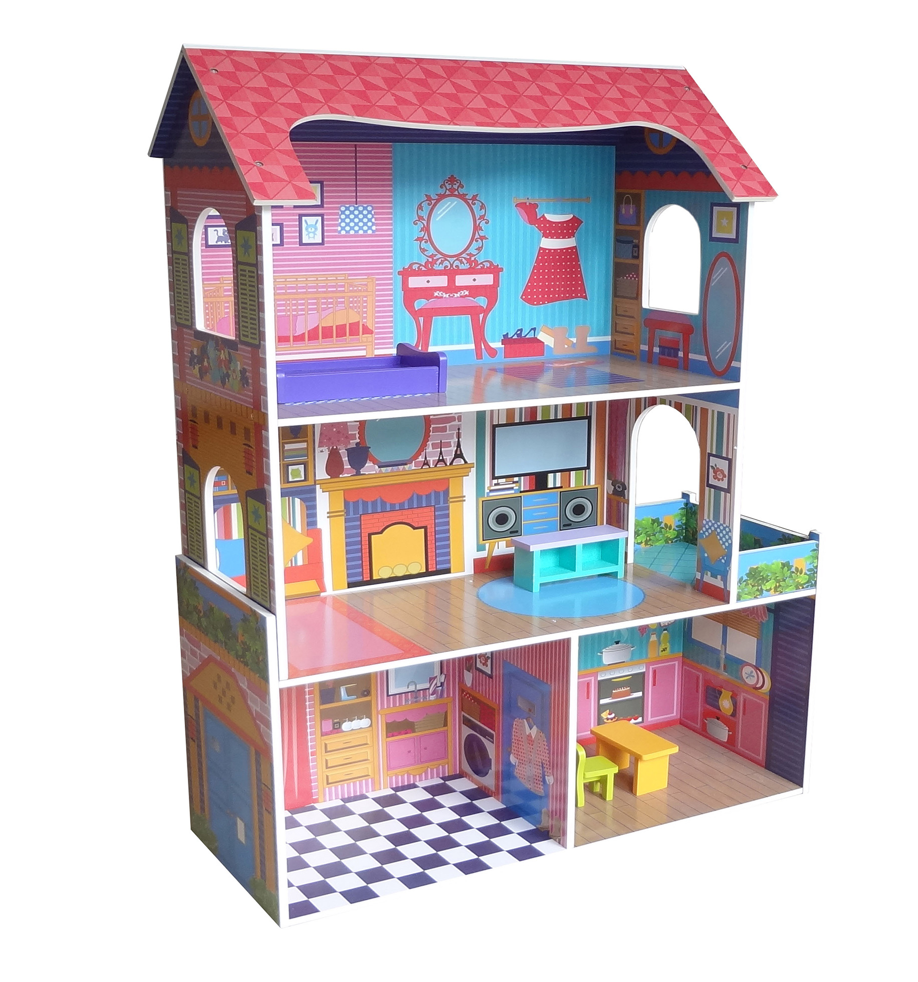 The three-story doll house boasts an elegant layout with plenty space that can be decorated according to your child’s taste.